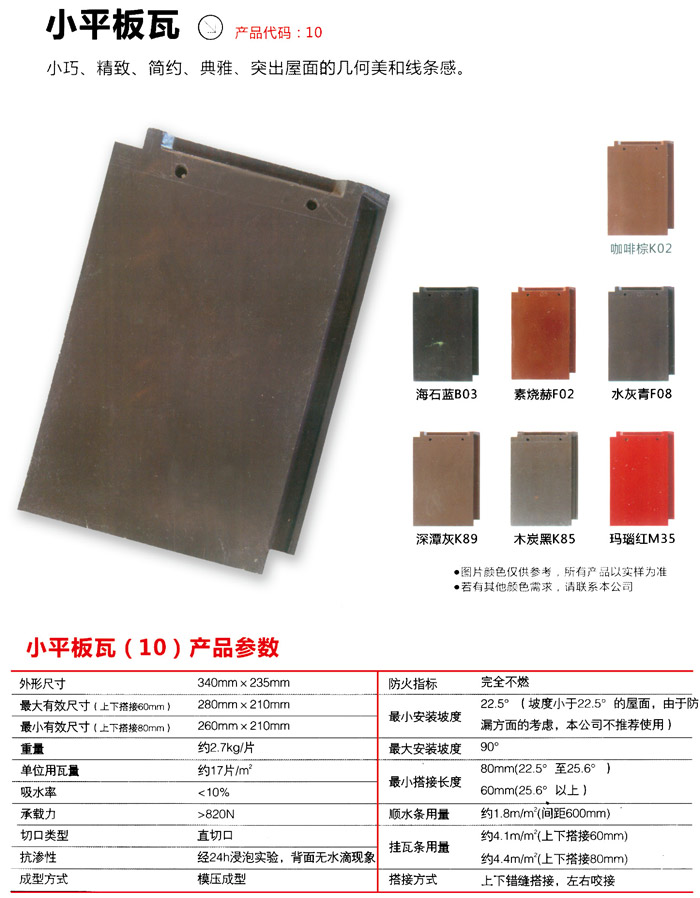 材料。先分辨著色層是混凝土還是漆料。混泥土彩瓦上色方式有二;其一:彩瓦著色層是混凝土與有機顏料、環氧樹脂及二氧化硅石料所組成,薄厚在0.5毫米上下。它粘合力強(與瓦另外制做)耐老化一般,歷經一定階段的風吹日曬非常容易退色。舊式制瓦和中小型瓦廠絕大多數用這類方式上色,緣故是低成本;其二:選用漆料噴漆,噴漆上色艷麗,一般噴漆干膜薄厚約在35um之上,經歷十數年的應用,久不掉色不脫落。